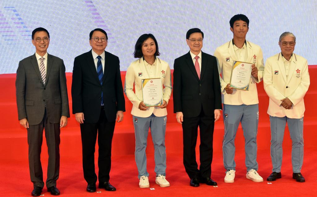 8月21日,香港特别行政区行政长官李家超(右三)为中国香港帆船运动员郑清然(右二)与马君正(左三)颁发表扬证书。新华社记者 卢炳辉 摄