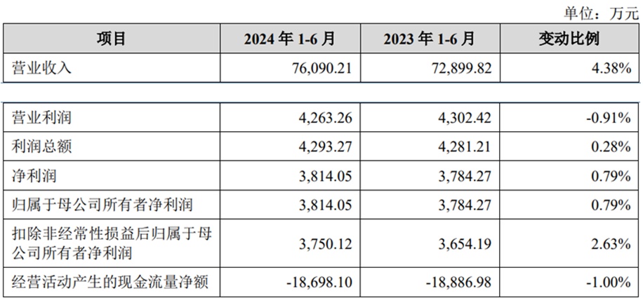 2024年1-6月,太湖远大的营业收入为76,090.21万元,同比增长4.38%;净利润/归属于母公司所有者的净利润为3,814.05万元,同比增长0.79%;扣除非经常性损益后归属于母公司所有者的净利润为3,750.12万元,同比增长2.63%;经营活动产生的现金流量净额-18,698.10万元,上年同期为-18,886.98万元。