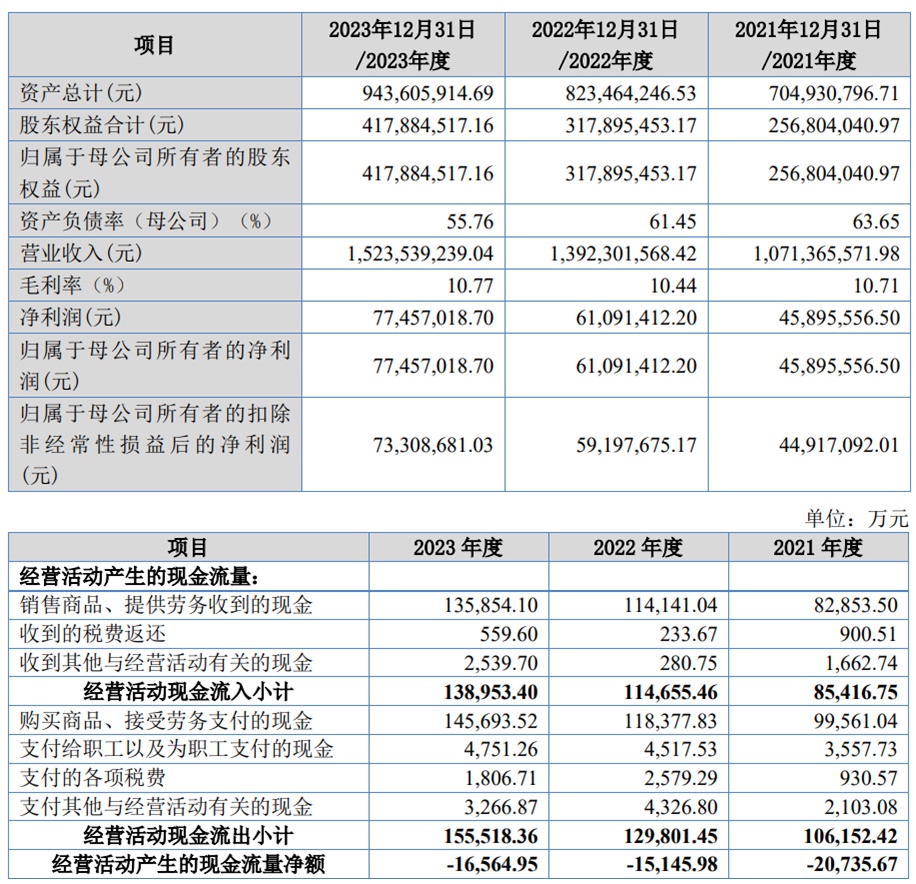 2021年至2023年,太湖远大的营业收入分别为107,136.56万元、139,230.16万元和152,353.92万元;净利润/归属于母公司所有者的净利润分别为4,589.56万元、6,109.14万元和7,745.70万元;归属于母公司所有者的扣非净利润分别为4,491.71万元、5,919.77万元和7,330.87万元。