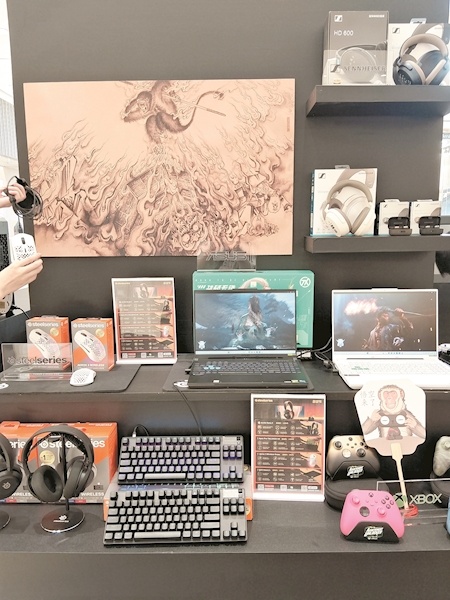 记者观察到,在线下游戏试玩区的两侧还设有展示架,上面摆放着与游戏合作的鼠标、键盘和联名款头戴式耳机。“如果预算充足的话,比较推荐罗技的gpw三代SUPERLIGHT这款鼠标。虽然这个游戏不涉及脚步声,但是玩其他游戏的话比较推荐赛睿的耳机,用来听脚步声比较好。”彭先生告诉记者,“这款游戏对电脑要求也很高,我们用了联想、英伟达和机械革命的高配置游戏本为试玩提供标准舒适的体验。”