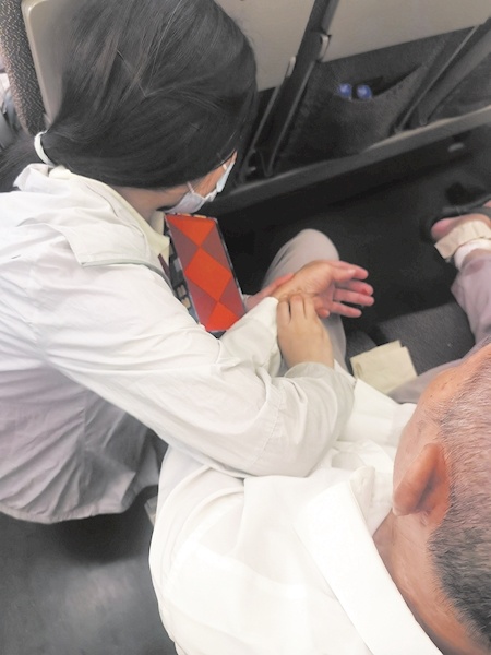 中午12时48分,坐在3号车厢的姜朵生听到了列车广播,立刻从行李中翻出自己随身携带的小药箱,赶去老人所在的7号车厢。经过查看,姜朵生发现老人右腿内踝上方2厘米处出现深部外伤,伤口长约8厘米,深3-4厘米,出血不止。她赶紧为老人消毒伤口,清理创面,包扎止血,随后对另外2处轻微擦碰伤进行消毒处理,并为老人进行全身触诊检查。目睹了姜朵生的细致问诊和处置,娄先生连连道谢。