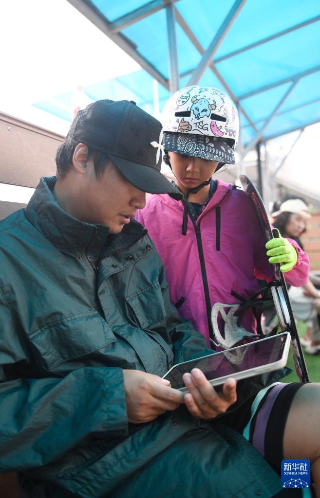 青少年滑雪运动员谷颖航(右)和教练通过视频回放分析动作细节(8月9日摄)。新华社记者 刘坤 摄