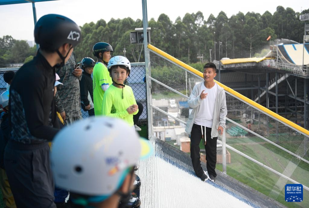 单板滑雪运动员张义威(右一)在成都尖锋旱雪四季滑雪场指导小学员(8月9日摄)。新华社记者 刘坤 摄