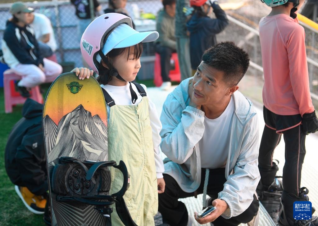 单板滑雪运动员张义威(右)在成都尖锋旱雪四季滑雪场指导小学员(8月9日摄)。新华社记者 刘坤 摄