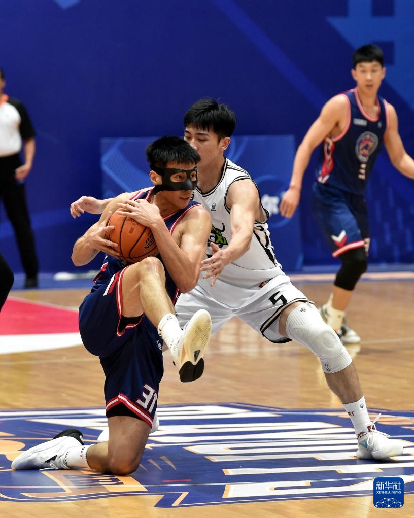 8月22日,香港金牛队球员孙晨然(左)与江西赣驰队球员马泽来在比赛中拼抢。新华社记者 卢炳辉 摄