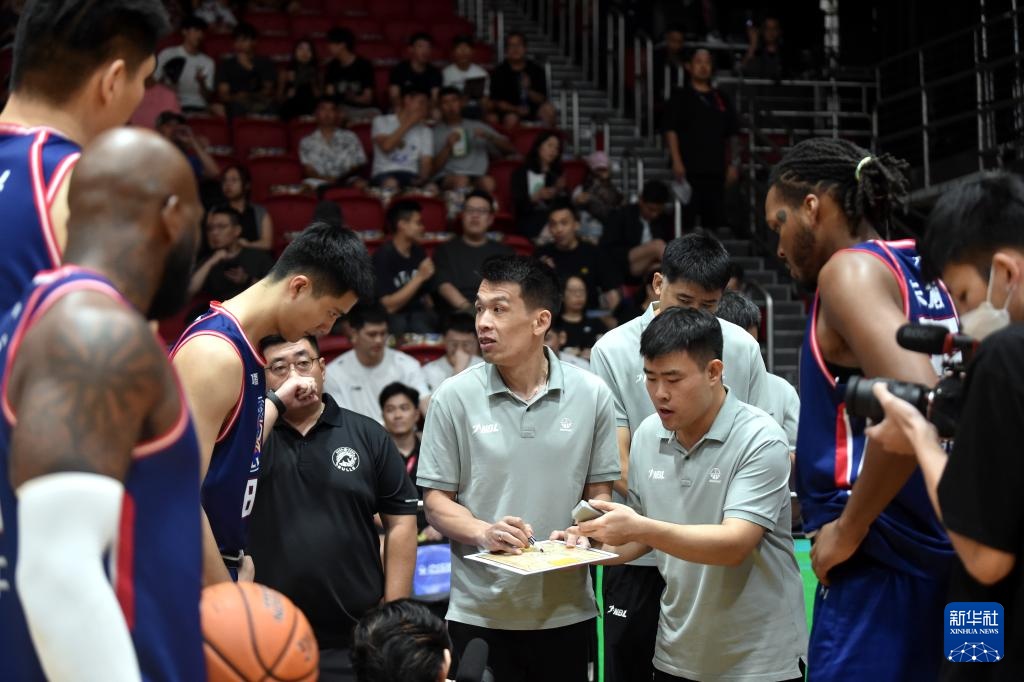 8月22日,香港金牛队主教练解立彬(中)在比赛间隙向球员布置战术。新华社记者 卢炳辉 摄