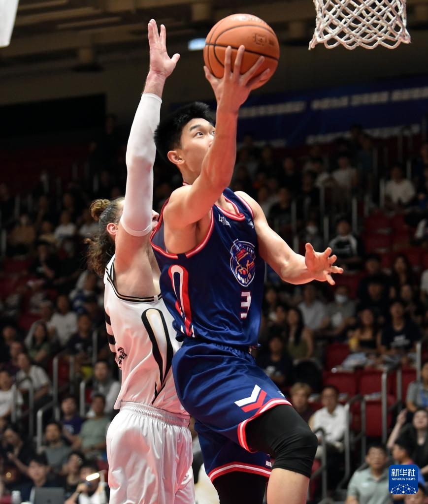 8月22日,香港金牛队球员朱松玮(左)在比赛中上篮。新华社记者 卢炳辉 摄