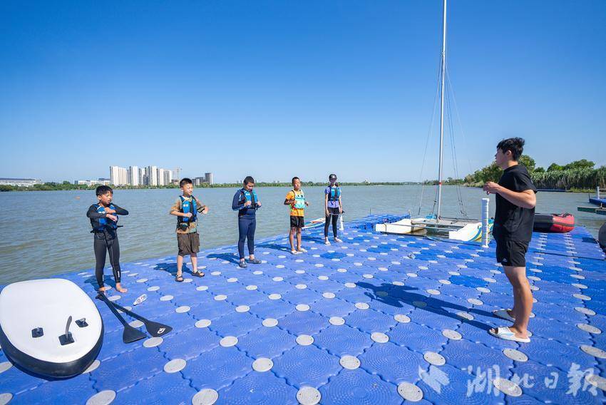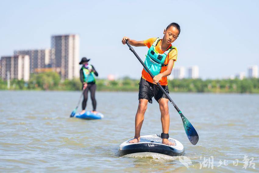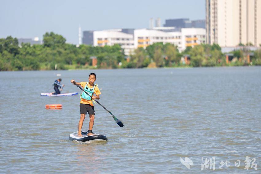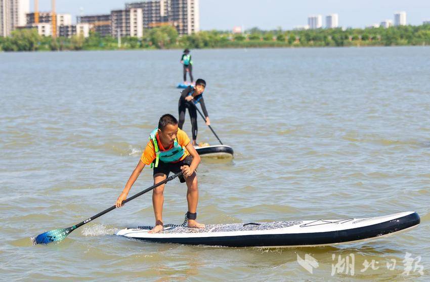 7月22日,在武汉市东西湖杜公湖国家湿地公园,不少青少年选择在暑假学习桨板运动。(湖北日报全媒记者倪娜 通讯员徐卉婷 晏君摄)