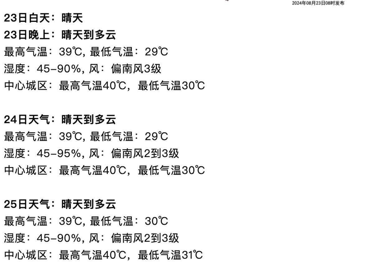 昨天武汉市晴天到多云,大部地区最低气温25℃~29℃,最高气温37℃~40℃,最高气温为江夏区湖泗站的42.6℃;今天早晨我市晴天,大部地区最低气温27℃~31℃。预计未来八天,受发展的高压系统控制,武汉市持续高温天气,大部地区最高气温38℃~39℃,局部地区达40℃以上;8月26日以后,武汉市多阵雨或雷阵雨。