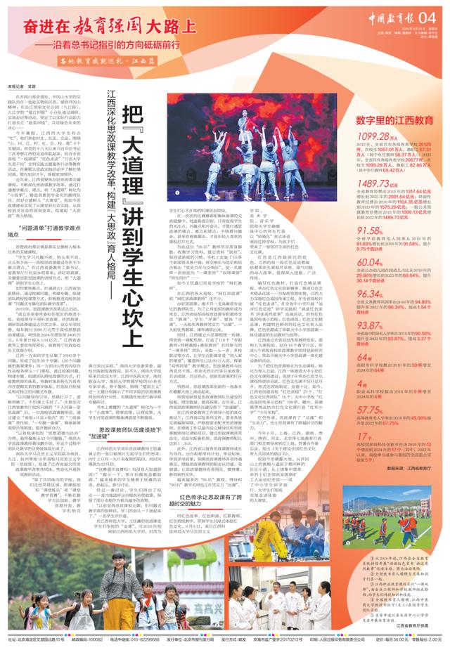 吉安市遂川县禾源中心小学学生在开展体育活动。江西省教育厅供图报道带你看江西深化思政课教学改革,构建“大思政”育人格局——把“大道理”讲到学生心坎上在井冈山革命遗址,井冈山大学的实践队员在一处处实物前沉思,感悟井冈山精神;在长江国家文化公园(九江段),九江学院“爱江护豚”小分队通过调研、实地走访等活动,坚定了以实际行动助力打造长江“最美岸线”、共迎绿色未来的决心……今年暑假,江西的大学生有点“忙”,他们奔赴村庄、社区、企业,围绕“山、河、江、村、社、企、校、瓷”8个关键词,将党的十八大以来习近平总书记三次考察江西的足迹串联起来,结合全省高校“一线课堂”“红色走读”“万名大学生进千站”文明实践志愿服务行动等教育活动,在暑期大思政实践活动中了解社情民情,增长知识才干,厚植家国情怀。近年来,江西省聚焦办好思政课关键课程,不断深化思政课教学改革,通过打通教学难点、堵点,将“大道理”转化为“小故事”,锻造高素质专业化的教师队伍,用好立德树人“大课堂”。现如今思政课建设实现了从课堂到社会实践、从高校到全社会的深刻变革,构建起“大思政”育人格局。“问题清单”打通教学难点堵点思想政治理论课是落实立德树人根本任务的关键课程。“学生学习兴趣不浓、抬头率不高、点头率不高……高校思政课建设存在不少难点堵点。”在江西省委教育工委书记、省教育厅厅长吴永明看来,讲好思政课,关键要创新思政课的讲授方式,把“大道理”讲到学生心坎上。如何聚焦难点,打通堵点?江西省创新路径,通过挖掘问题、构建专题、组建团队跨校授课等方式,积极推进高校思政课“问题式专题化团队教学改革”。2019年,思政课教学改革试点启动。“成立由省委常委担任组长的推进小组。省级领导干部听思政课、讲思政课、调研思政课建设达百次之多。设立专项经费,每年拨付2000万元用于高校思想政治课建设,特别是2024年增加至2400万元,5年累计投入1.04亿元。”江西省委教育工委宣传部部长、省教育厅社政处处长王宣海介绍。江西一方面向学生征集了2000余个问题,形成了包含38个专题、128个问题链的教案课件;另一方面由5所省内综合性高校各牵头一门课程,通过挖掘问题、构建专题、组建团队跨校授课的方式,打破教材原有体系,将教材体系转化为具有内在逻辑关系的教学体系,打造前后衔接又相对独立的问题式专题。“以问题导向引导,思路打开了,逻辑明晰了,不怕课上不好了。”在参加完江西省教育厅组织开展的“千人同备一堂思政课”后,一位高校思政课教师说。通过建立“省级+片区+校内”的“三级备课”责任制、“一专题一备课”、集体备课观察员等制度,提升教研合力。“以我校承担的‘思想道德与法治’为例,最终凝练出53个问题链。”南昌大学思政课教师蒋田鹏介绍,在这个过程中团队化教学的优势就体现出来了。南昌大学马克思主义学院联合南昌、九江、抚州等地18所高校马克思主义学院(思政部),组建了江西省最大的思政课教学改革共同体,常态化开展各项教研活动。“除了共同体内的学校,我们还经常跨区域、跨课程组织‘课堂练兵’和‘课堂教学竞赛’,不断在教学方法创新、教学资源开发、教学机制完善方面出实招。”南昌大学党委常委、副校长陈始发教授说。前不久,南昌大学组织来自武汉大学、江西中医药大学、南昌职业大学、南昌大学附属学校的50余名专家学者、骨干教师,围绕“爱国主义”这一主题分别展示了不同学段的思政课教师如何有针对性、有侧重性地进行教学和专题研讨。书本上难懂的“大道理”转化为一个个“小故事”,借事说理,以理说事,大学生对思政课的整体满意度不断提高。思政课教师队伍建设按下“加速键”江西师范大学青年思政课教师王钰鑫展示的一张巨幅图片引起学生们的思考:PPT上只有一大片未收割的稻田,而时间落款为12月份。“这难道不浪费吗?有没有人知道原因?”“提示一下,图片拍摄地是鄱阳湖。”越来越多的学生随着王钰鑫的话语,抬起头,参与讨论。经过一番讨论,学生们得出了结论——是当地政府出台粮农补偿政策,保留了部分水稻作为候鸟越冬的食物。“以前觉得思政课很无聊,但问题式教学真的很鲜活,学习的劲头一下就起来了。”一名学生评价道。在江西师范大学,王钰鑫的思政课是学生们争抢的“金课”。可2018年他刚到江西师范大学时,时常为学生们心不在焉的听课状态烦恼。在一次次的比赛磨砺和集体备课的交流碰撞中,他逐渐意识到,只有发现学生的关注点、兴趣点和兴奋点,才能打通思政课的痛点、难点和堵点;不绕着问题走,甚至奔着难题去,才是年轻人喜欢的课程打开方式。为此这位“85后”教师用尽浑身解数:收集学习资料,建立资料“厨房”;保持读新闻的习惯,手机上安装了10多个新闻资讯客户端;将交响乐与党史相结合推出“党史百年与交响乐”,变一名教师一讲到底为“一课多师”“双师课堂”“师生同台”……如今王钰鑫已经是学校的“网红教师”。在江西的各大高校,“网红思政课”和“网红思政课教师”还不少。办好思政课,离不开一支高素质专业化的教师队伍。为了让有组织的教研成为常态,江西省组织高校思政课专职教师全员“晒课”、学生“评课”、媒