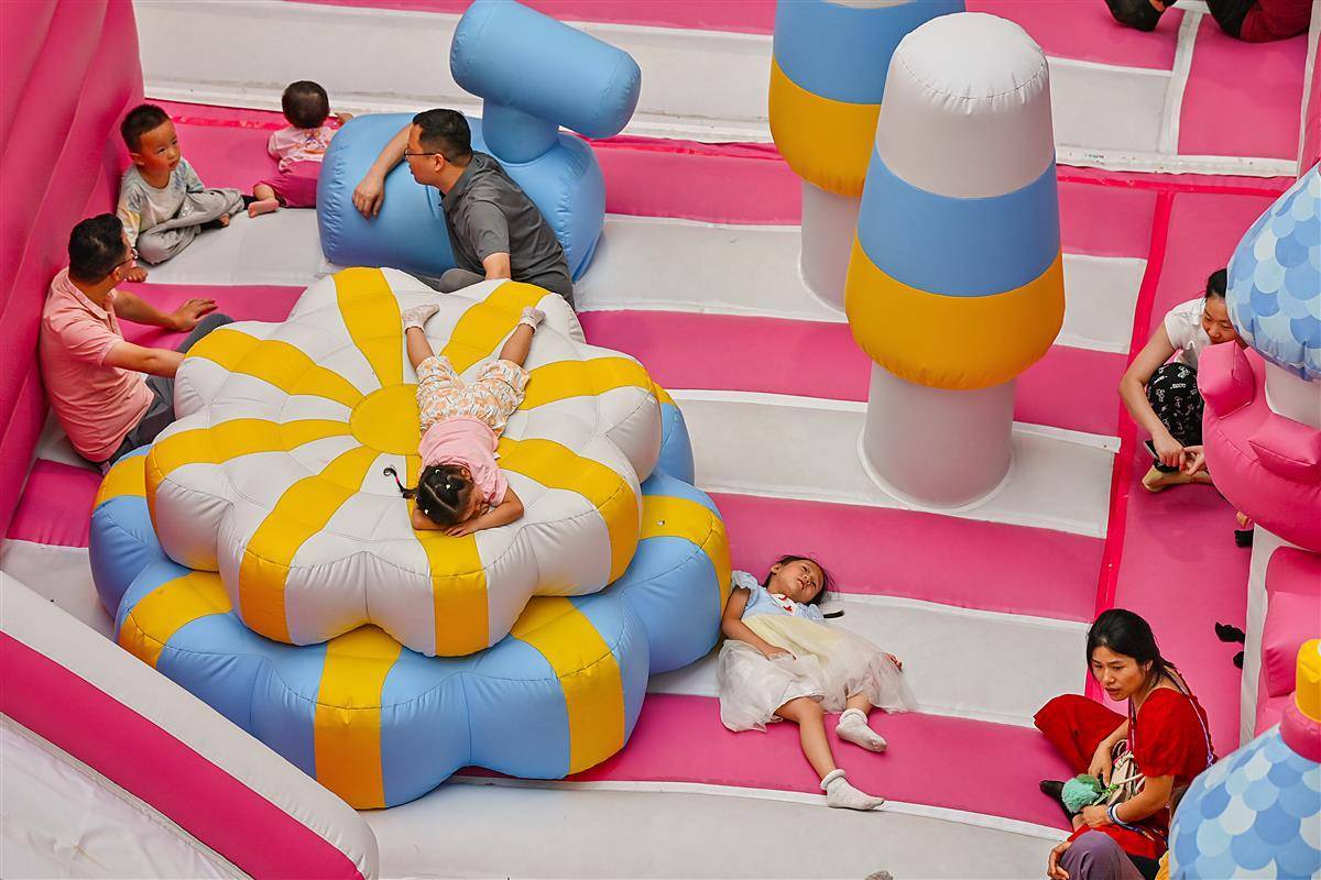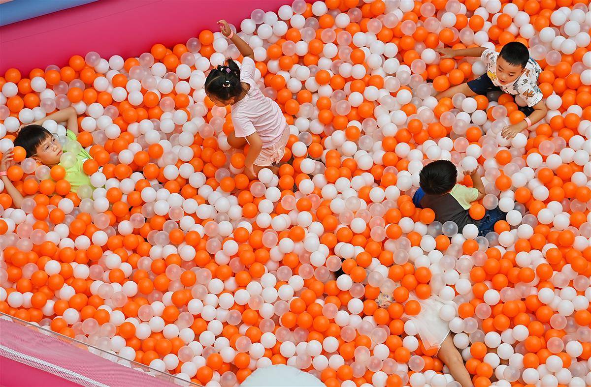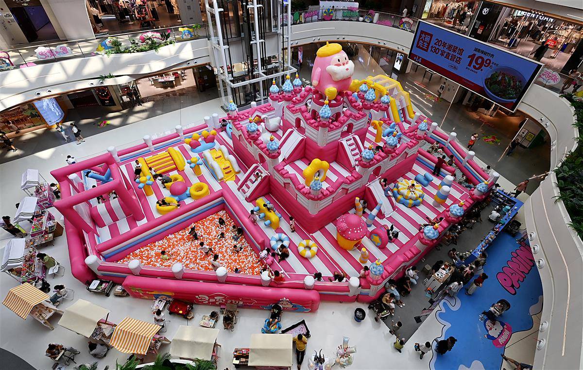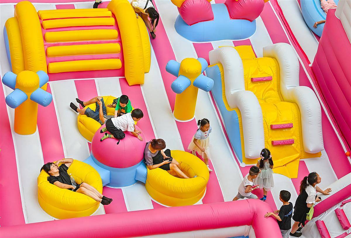 8月22日,武汉洪山区白沙洲某大型商业综合体的中庭内,一个以儿童为主题的充气城堡引来了许多游乐的孩子,这里成了孩子们放飞自我的场所。入伏以来,商场成为市民纳凉的好去处,孩子们也成了武汉各大商场的“主角”。(湖北日报全媒记者朱熙勇摄)