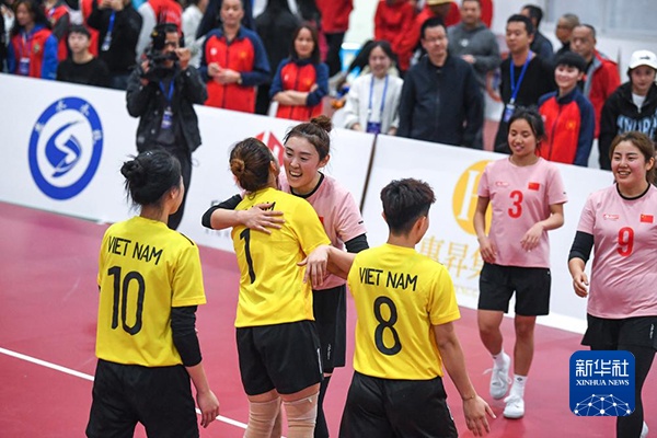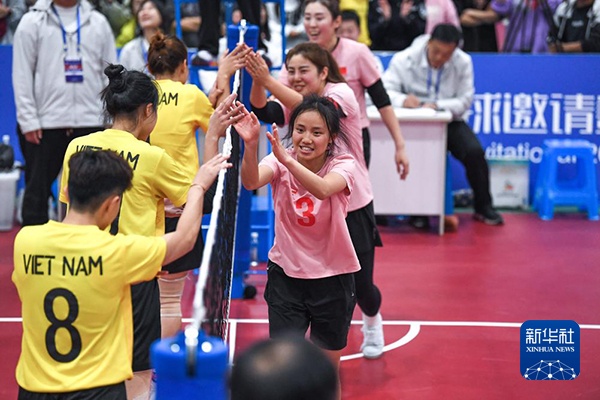 2023年11月21日,中国队球员(右)与越南队球员在2023年东盟杯国际藤球邀请赛单组赛女子组决赛后击掌致意。新华社记者 杨文斌 摄