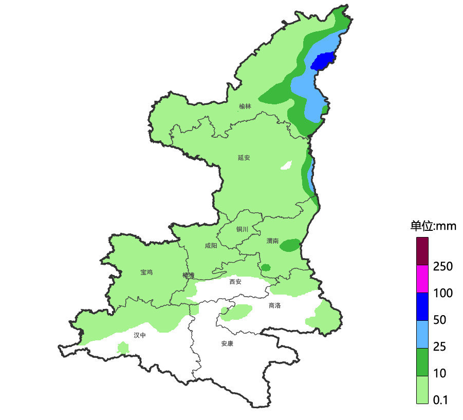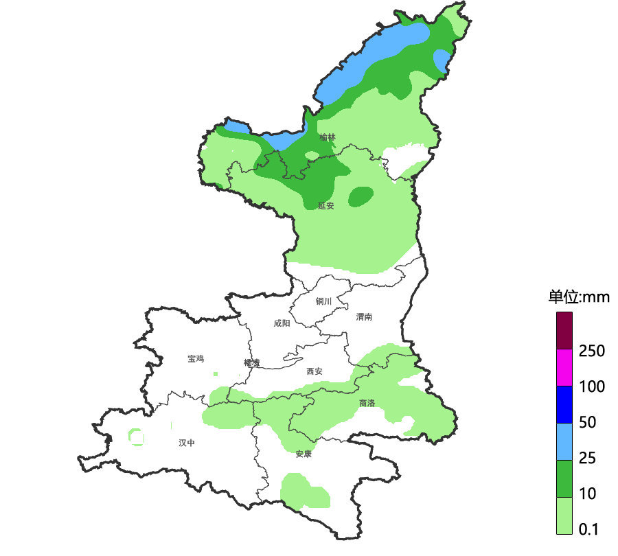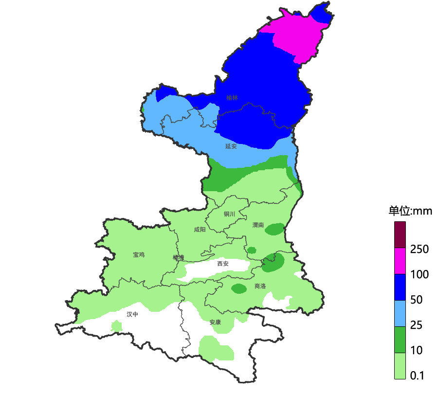 过程累计量,陕北北部50~140毫米,陕北南部30~60毫米,关中、陕南部分5~15毫米。