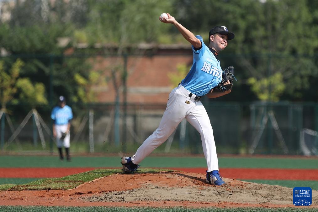8月24日,清华大学棒球队选手鲍睿熙(右)在比赛中。新华社记者 贾浩成 摄