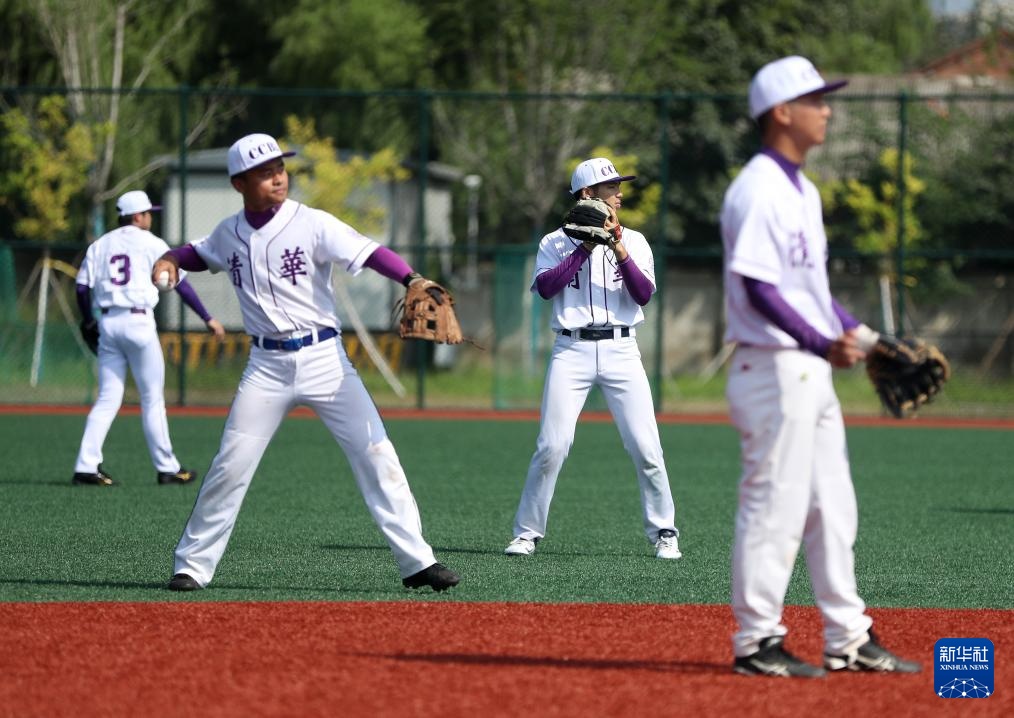 8月24日,清华大学棒球队选手在比赛前热身。新华社记者 贾浩成 摄
