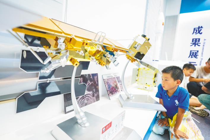 湖北珞珈实验室展厅,参加夏令营的孩子们好奇地打量着各种型号的珞珈系列卫星。 (湖北日报全媒记者 魏铼 摄)