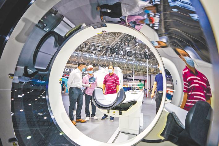 世界大健康博览会联影医疗展区,CT机系列产品和智慧手术室,和飞利浦、GE等国际巨头同台比拼。(湖北日报全媒记者 魏铼 摄)