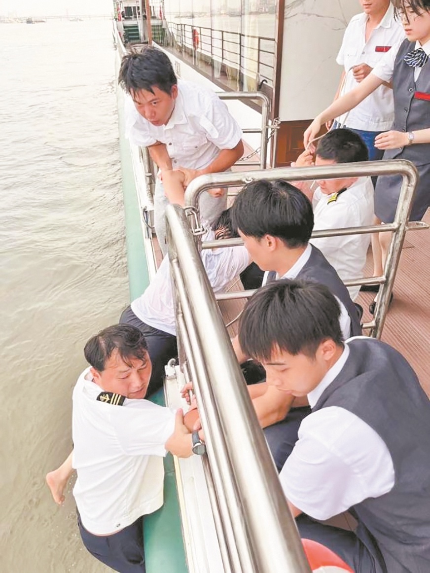“当时通知发现女孩时,我在驾驶室,船停靠在岸边,游客正在登船。我跑过去发现,女孩套着一只救生圈,正努力抓住左侧船舷,以免被水流冲走。”胡堃说,“由于船高约1.5米,抛绳下去女孩无力抓牢,我就翻身挂在船侧,抓住女孩的手把她拉住了。”