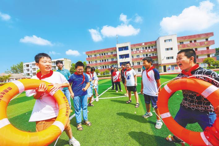 8月20日,鄂州华容区临江乡粑铺村临江中心小学,武汉工程科技学院志愿者和消防员给留守儿童重温防溺水常识。