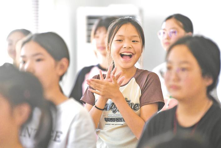 8月8日,房县窑淮镇窑场村七年级学生陆奕含在志愿者带领下,和同学一起欢声歌唱。