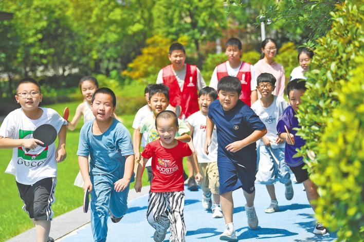 8月7日,襄阳襄州区浩然街道育红社区的孩子们练乒乓球前热身。该区首次尝试在商圈楼宇附近开办“暑假学堂”爱心托管班,有效解决新就业群体子女托管难的问题。