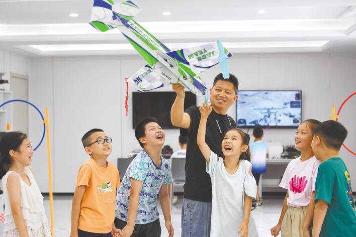 8月8日,十堰市张湾区国瑞里社区“暑假学堂”公益托管班,孩子们学习航模知识。该区依托村(社区)党群服务中心等场所,对接优质托育资源,提供爱心陪伴、素质拓展等公益服务。