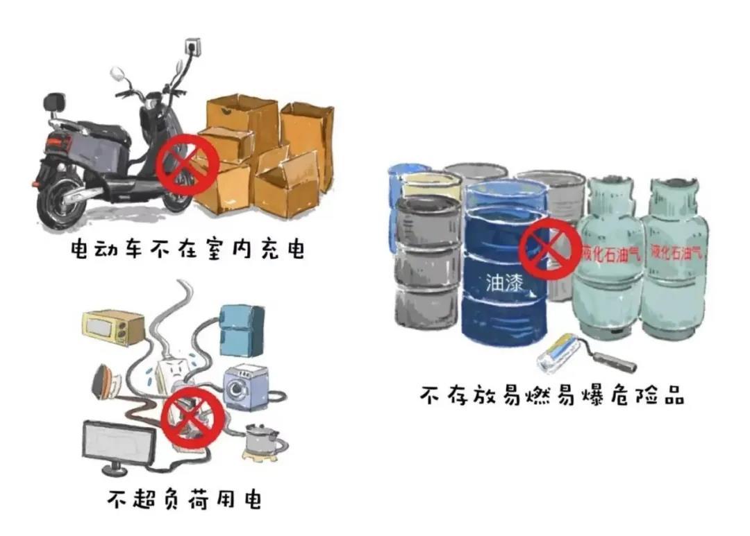 电动车不在室内充电;不超负荷用电;不存放易燃、易爆等危险物品。