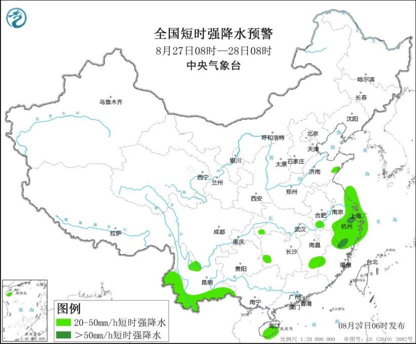 预计,8月27日8时至28日8时,江苏、浙江、上海等地的部分地区有较强降水,量级以大到暴雨为主,局地大暴雨。内蒙古地区东北部、江淮东部、江南东北部和南部、西南地区东南部等地的部分地区将有8级以上雷暴大风或冰雹天气;黄淮东部、江汉西部、江淮西南部和东部、江南中东部、西南地区南部、华南南部等地的部分地区将有小时雨量大于20毫米的短时强降水天气,其中,浙江北部和南部、福建北部等地的部分地区小时雨量大于50毫米,最大可达80毫米以上。中央气象台8月27日6时发布强对流天气蓝色预警。