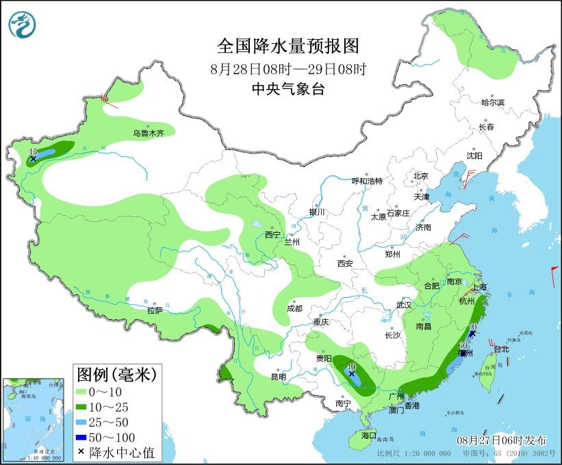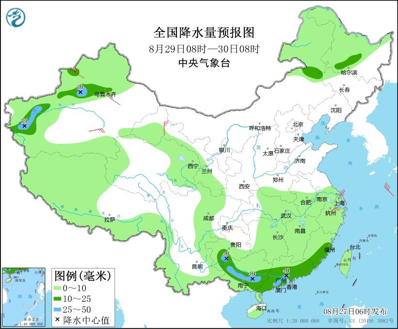 8月29日8时至30日8时,新疆沿天山地区及南疆盆地西部、内蒙古东北部、黑龙江南部、福建东南部、广东中南部、贵州南部、广西西部和南部等地有中雨,部分地区有大雨(25~40毫米)。新疆沿天山地区和南疆盆地、甘肃河西、浙江等地的部分地区有4~6级风;东海北部海域有9~10级、阵风11级减弱到7~8级、阵风9级的旋转风转偏北风。