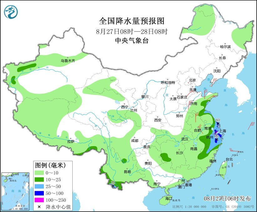 8月27日8时至28日8时,新疆南疆盆地西部、山东东南部、江淮东部、江南东部、云南西南部等地有中到大雨,其中,江苏东南部、上海西部、浙江北部等地的部分地区有暴雨,局地大暴雨(100~110毫米)。河北南部、天津南部、山东大部、河南东部、安徽中北部、江苏北部、浙江北部等地部分地区有5~6级、阵风7~8级的大风;渤海南部海域、黄海中西部海域有7级、阵风8~9级的大风。