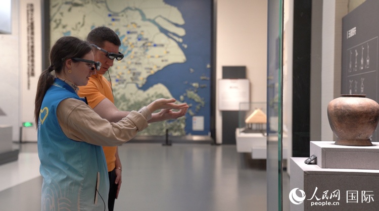 人民网外籍专家在良渚博物院体验AR眼镜。人民网记者 袁蒙摄