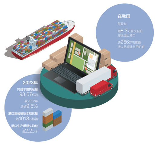在港口方面,2023年,我国港口生产用码头泊位达2.2万个,增加万吨级泊位127个,港口自动化技术水平和应用规模总体位居世界前列,有力提升了我国港口生产运营管理服务水平。