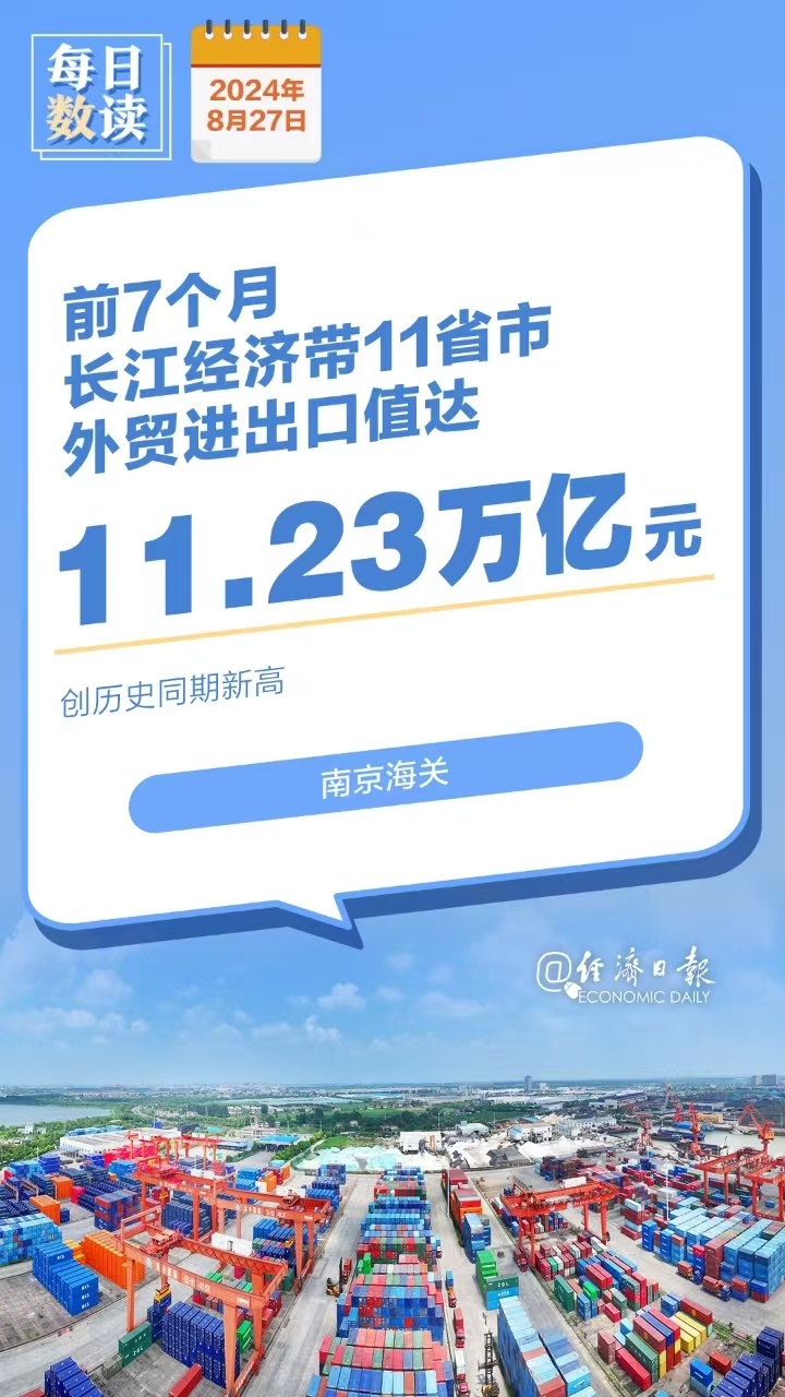 今年前7个月,长江经济带11省市外贸进出口值达11.23万亿元,创历史同期新高,占全国进出口总值的45.2%。其中,江苏省外贸进出口3.15万亿元,增长8.1%,地区外贸占长江经济带外贸总值的28.1%,位列长江经济带首位。出口方面,长江经济带11省市高新技术产品进出口3.12万亿元,增长8.4%,占全国高新技术产品进出口48.8%。