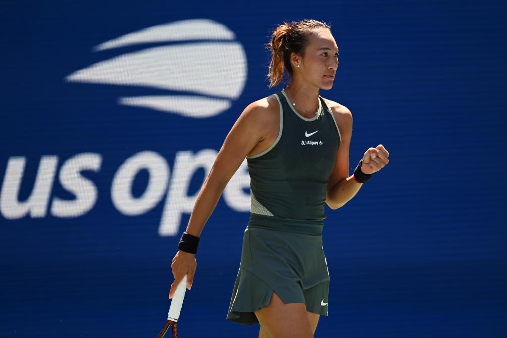 8月26日,郑钦文在比赛中庆祝得分。新华社记者 李睿 摄
