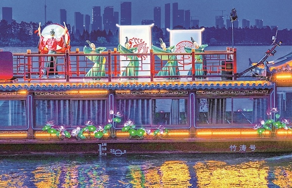 一艘古香古色的画舫伫立在湖中央,在这条画舫的旁边是一条并排同行的演艺游船,甲板上身着古色古香传统服饰的舞蹈演员,伴随着建鼓的击打和优美的音乐翩翩起舞,在光影变幻中呈现了一场视听盛宴,吸引画舫中及沿岸观众纷纷举起手机,记录下这美好一刻。