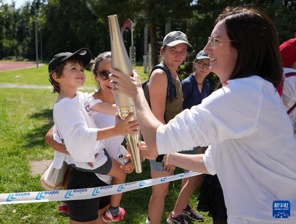 8月27日,一名小朋友触摸火炬。新华社记者 贺灿铃 摄