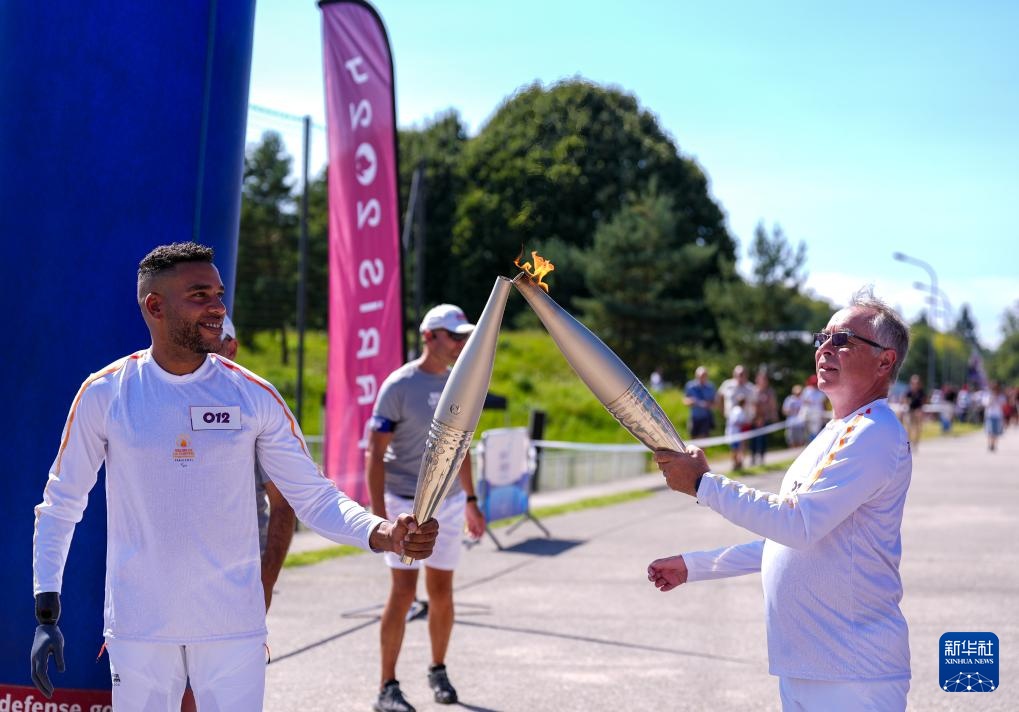 8月27日,火炬手帕斯卡尔·贝朗热(右)和阿兰·阿卡波进行火炬传递。新华社记者 连漪 摄