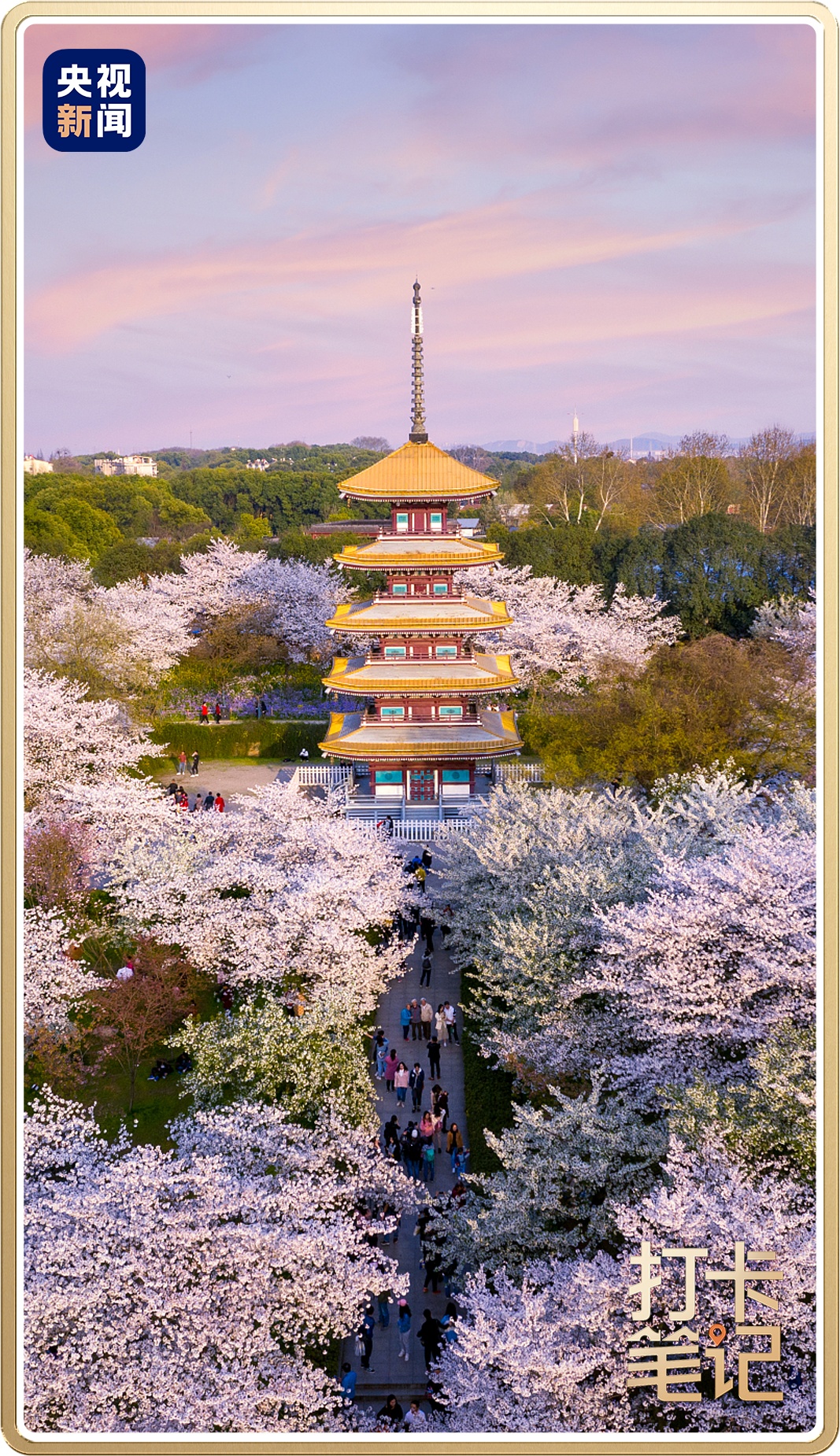 △东湖樱园有万余株樱花,是“世界三大樱园”之一。地标五重塔被樱花层层包围,樱花飘落时,如梦似幻。