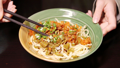 5️⃣热干面到手第一件事,拌!武汉话念作“笨”,拌的动作要麻利,要不然就坨了,武汉人称之为“憨了”。“热干面要快点笨,不然一哈就憨了。”