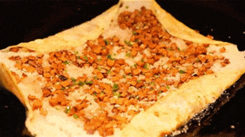 豆皮是另一款过早经典。制作豆皮,先在锅里摊一层米浆,打入一层蛋液,铺上厚厚的糯米饭,再倒入提前炒好的肉丁、香菇、笋丁等,切块、撒葱花、出锅,几块下肚,能“顶”到中午。