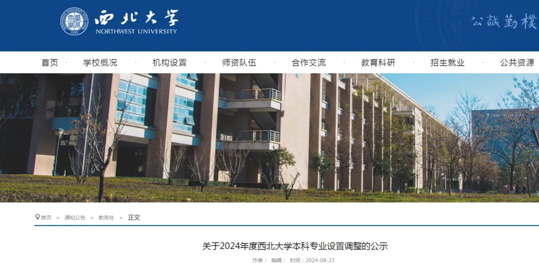 8月23日,西北大学发布《关于2024年度西北大学本科专业设置调整的公示》,拟申请撤销汉语言、金融工程、财政学、管理科学、图书馆学、广告学、视觉传达设计共7个本科专业,拟申请将城乡规划专业的修业年限调整为4年。同时,还拟申请备案4个专业,分别是:人工智能专业、集成电路设计与集成系统、环境科学与工程、数字经济专业。