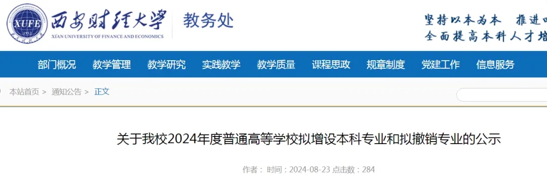 8月23日,西安财经大学官网发布《关于我校2024年度普通高等学校拟增设本科专业和拟撤销专业的公示》,拟增设数据科学、足球运动两个专业,撤销农林经济管理。
