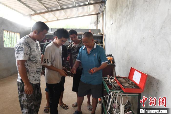 图为蒋德明(右一)向青年农机手介绍维修工具的使用方法。林浩 摄