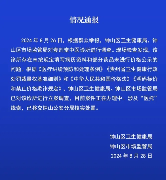 根据《医疗纠纷预防和处理条例》《贵州省卫生健康行政处罚裁量权基准细则》和《中华人民共和国价格法》《明码标价和禁止价格欺诈规定》,钟山区卫生健康局、钟山区市场监管局已对该诊所进行立案调查,目前案件正在办理中。涉及“医托”线索,已移交钟山公安分局核实处置。