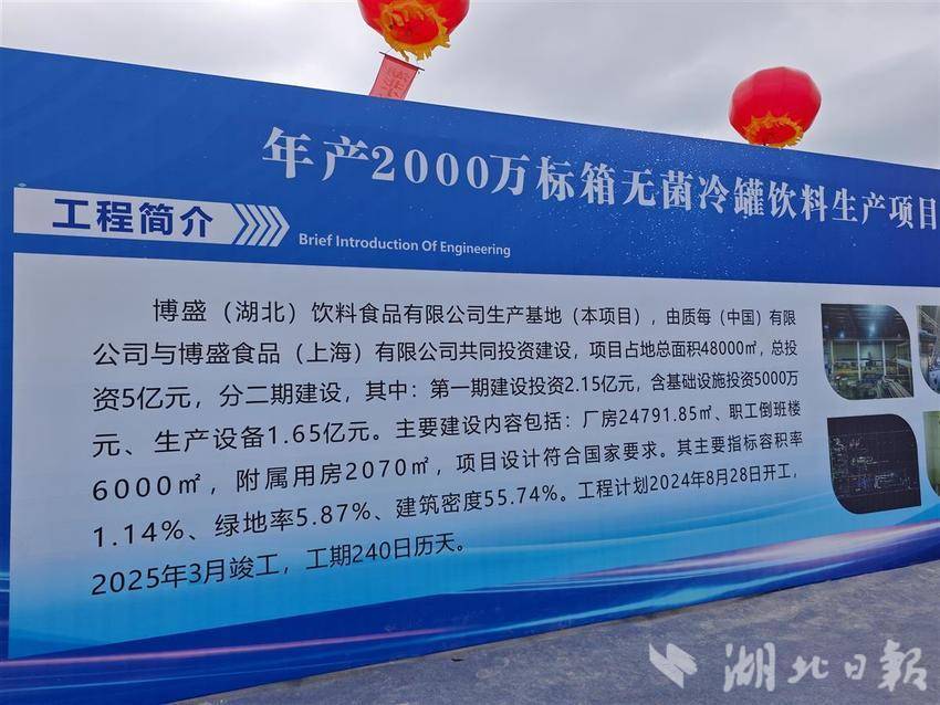 据了解,博盛(湖北)项目占地4.7万平方米,厂房面积2.8万平米, 总投资超过5亿元以上,一期实际投资2.15亿元以上;项目将引进德国最先进的全自动高速无菌冷灌生产线,可年产2000万标箱的无菌冷罐装饮料,目前,同等配置设备在华中地区智能化程度最高,填补了地区市场空白。第一期项目建成后,年产值可达5亿元以上,实现利税5000万元以上,项目预计2025年5月底之前正式投产运营并满负荷生产。