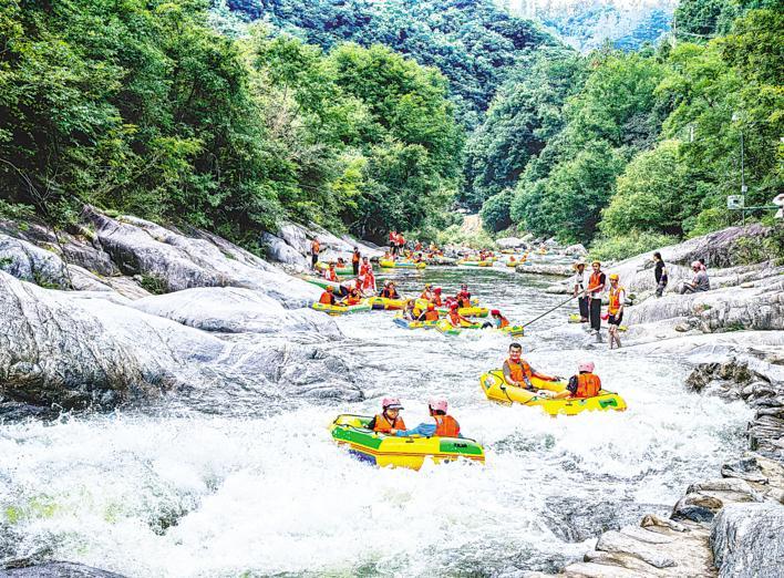 8月17日,游人在英山县桃花冲漂流景区内游玩。近年来,英山县依托大别山核心保护区良好的生态环境和山水资源优势,大力发展“春看花、夏漂流、秋赏叶、冬滑雪”的四季文旅新场景、新业态,不断推进农文旅融合发展,激发消费新活力。
