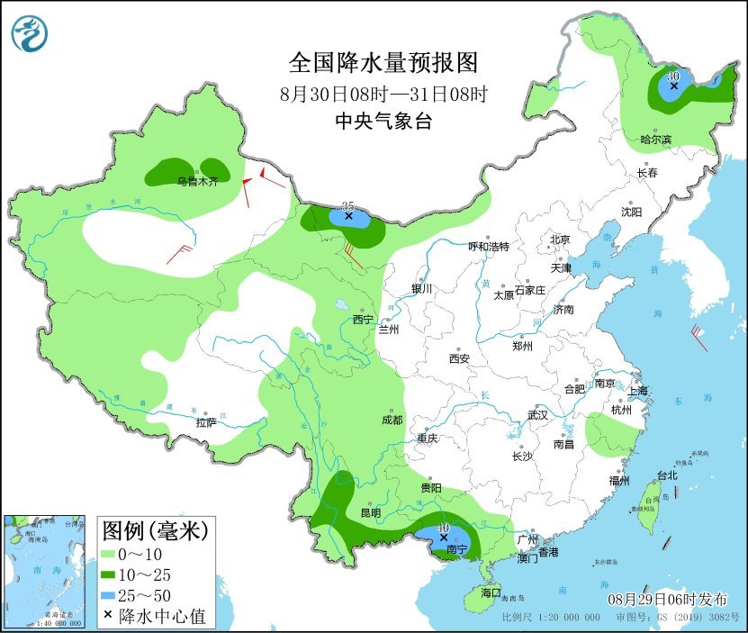 8月30日08时至31日08时,新疆伊利湖谷、内蒙古西部、黑龙江北部、西藏、云南中部和南部、广西西部等地部分地区有中到大雨(25~40毫米)。内蒙古西北部、新疆南疆盆地等地部分地区有4~6级风,其中,新疆山口地区部分地区有7~9级风,阵风可达11级以上。