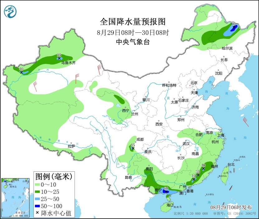 8月29日08时至30日08时,新疆沿天山地区和伊犁河谷、青海东北部、内蒙古东北部、黑龙江中西部、福建中部、广东南部和广西西部和南部等地部分地区有中到大雨,其中,黑龙江西北部、广西东南部沿海等地部分地区有暴雨(50~60毫米)。内蒙古西北部、新疆沿天山地区和南疆盆地、甘肃河西等地将有5~6级、阵风7级的大风,其中新疆山口部分地区将有7级、阵风8级的大风。