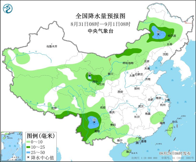 8月31日08时至9月1日08时,青海东北部、甘肃西南部、内蒙古中部、黑龙江西南部、吉林西北部、云南西部以及西藏东南部等地部分地区有中到大雨(25~40毫米)。内蒙古西北部、黑龙江东北部等地部分地区有4~6级风。