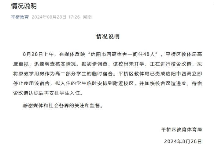 中新网8月29日电 河南省信阳市平桥区教育体育局28日下午在官方微信公众号上发布情况说明称,8月28日上午,有媒体反映“信阳市四高宿舍一间住48人”。平桥区教体局高度重视,迅速调查核实情况。据初步调查,该校尚未开学,正在进行校舍改造,拟将原教学用房作为高二部分学生的临时宿舍。